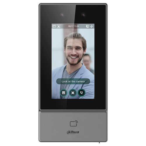 Terminal/WiFi i mrežni kontrolor za kontrolu pristupa s Full HD DWDR kamerom za prepoznavanje lica, mifare čitačem, senzorom za otisak prsta i virtuelnom tipkovnicom; 4.3″ kapacitivni ekran osjetljiv na dodir (rezolucija 480×272); 2MP CMOS dual-lens kamera, DWDR, s IC svjetlom; Preciznost prepoznavanja 99.9%; Brzina prepoznavanja 0.2s; Visina/Udaljenost detekcije lica 1.1-2.0m/0.3-1.5m; Udaljenost očitavanja kartice 0 cm–3 cm; Podržava do 6.000 korisnika, 10.000 kartica, 6.000 šablona lica i 6.000 šifri; Memorija 300.000 događaja; Do 128 vremenskih rasporeda; potpora za detekciju maske na licu i zaštitne kacige; potpora za QR kod posjetioca i funkcija pozivne ploče (video poziv); Glasovna obavještenja; Funkcije kontrole pristupa: Anti-passback, multi-user autentifikacija; Intrusion alarm, Duress alarm, Tamper alarm; Bazer; 1x USB 2.0, 1x RS485; 1x Wiegand; 3x ulaza (stanje vrata x1, REX x1, alarm IN x1); 1x Alarm OUT; 1x detekcija statusa vrata; 1 relej (brava x1); RJ45 (10/100M), WiFi IEEE802.11b/802.11g/802.11n 2.4GHz; Protokoli: UDP, TCP, IPv4, RTSP, SIP, P2P, RTP; Interoperabilnost: CGI, ONVIF; OSDP protokol; SDK i API; Napajanje PoE ili 12V/1.5A, potrošnja ≤12 W; Kućište od plastike ojačano staklenim vlaknima; Dimenzije 180.1 mm × 90.1 mm × 27.0 mm; Masa 0.70kg; Radna temperatura -30°C-+60°C; IP65 stupanj zaštite; u pakiranju s strujnim adapterom i zidnim nosačem