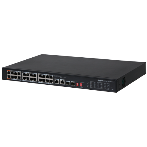 2x 10/100/1000 Base-T (Combo); 2x 1000 Base-X (Combo); 24x 10/100 Base-T (PoE); PoE budžet 240W; Do 60W po priključku maksimalno (za priključak 1 i 2); Do 30W na priključcima 3-24; Intelligent PoE; U skladu s IEEE802.3af, IEEE802.3at i HiPoE; 4 načina rada – PD Alive, Extend mode, VIP priključak, priključak Isolation ; Switching Capacity 8.8G; Packet Forwarding Rate 5.5472Mpps; Napajanje 220VAc; Radna temperatura -10°C~55°C; Dim. 1U 440mm × 300mm × 44mm